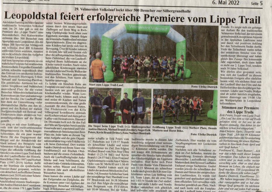 In den vergangenen beiden Jahren galt der Trail noch als Geheimtipp, obwohl er schon Läufer vom Ruhrgebiet bis nach Berlin ins kleine Leopoldstal zum Lippe Trail führte. Doch das ändert sich nun dieses Jahr mehr und mehr durch die positive Mundpropaganda in der Laufszene und die Presseberichterstattung über den Lauf. So hat haben die Lippische Landeszeitung und die Neue Westfälische erstmals eine regionale Empfehlung zu unserem Volkslauf ausgesprochen und den Lippe Trail als kleinen Bruder vom Hermannslauf gefeiert (siehe Anhang). Damit stehen wir nach bereits drei Jahren der Einführung auf Augenhöhe mit den traditionsreichen Läufen wie den Paderborner Osterlauf und dem Luisenturmlauf in Borgholzhausen.